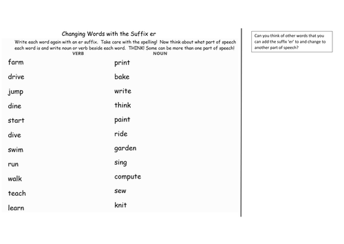 Adding A Suffix Er To Change A Verb To A Noun Teaching Resources