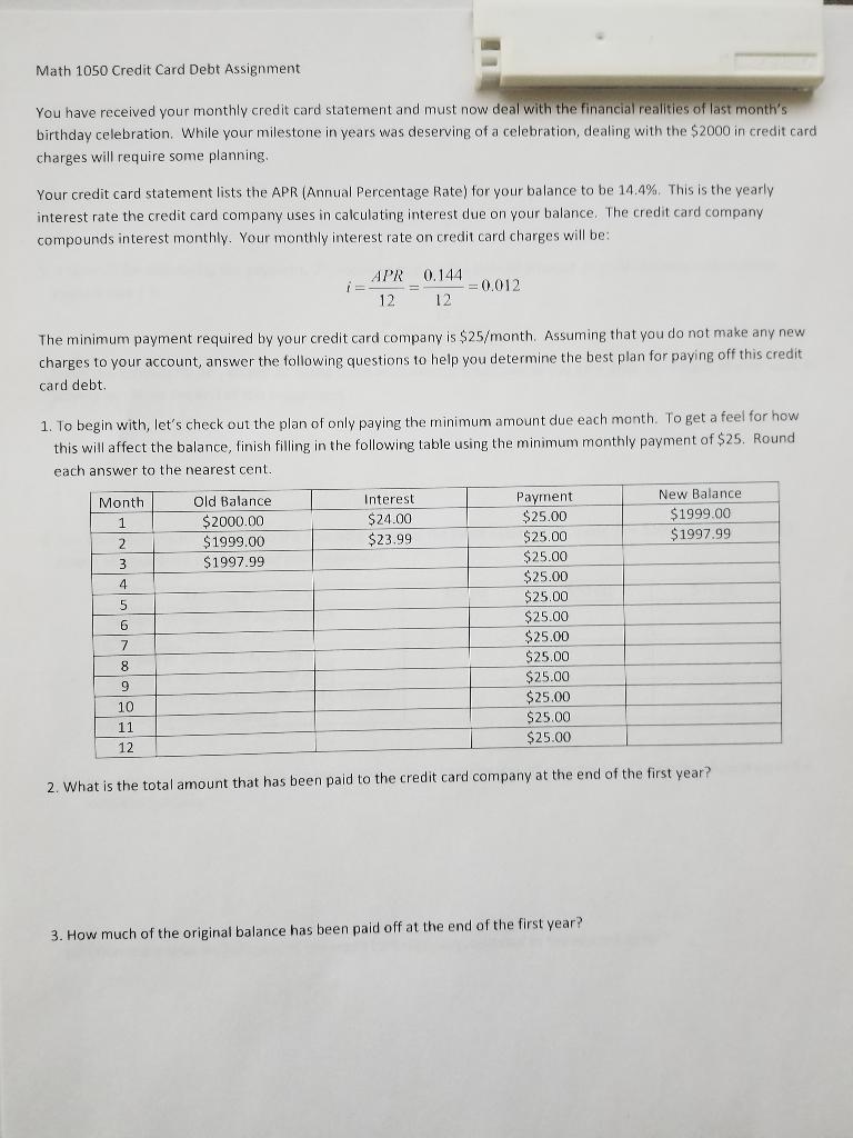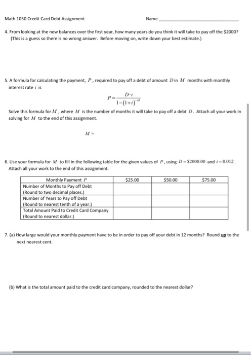 Solved Math 1050 Credit Card Debt Assignment Name You Have Chegg Com